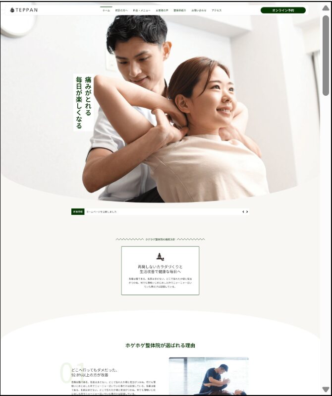 施術メニュー紹介やスタッフ紹介、お客様の声、オンライン予約機能など、来院前の不安を解消しつつ信頼を築くための要素を豊富に備えています。